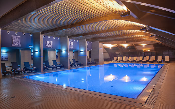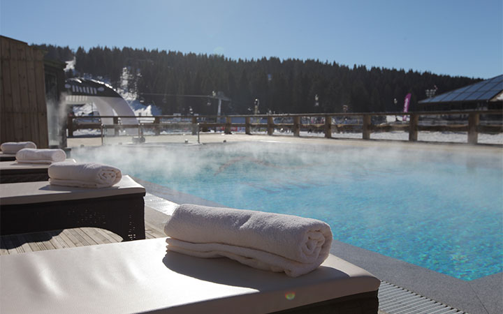 Неограниченное посещение велнес-центра (1800 м2): крытый бассейн (18×9 м), гардеробная (шкафчик, халат, тапочки, полотенце), зона отдыха, инфракрасная сауна, финская сауна, русская баня, тропический дождь, турецкая баня, соляная пещера, Кнейп-терапия, открытые бассейн и джакузи с подогревом воды и видом на лыжные трассы, фитнес-центр;