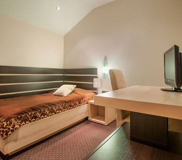 Оснащение номеров: ЖК-телевизор с кабельными каналами, телефон, DVD-плейер, мини-бар, сейф, махровый халат, фен, душевая с туалетом, беспроводной интернет.Одноместный номер «Стандарт» 1/1
